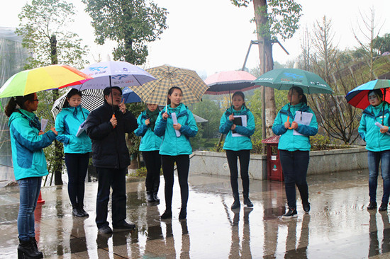 12月15日,院長李永明一行到長壽區(qū)菩提山風景區(qū),對景區(qū)導游進行《中華長壽寶典導游詞》的專題培訓。當天氣溫驟降,李院長帶領十多名導游,冒雨迎風,從山腳景區(qū)大門起步一路拾級而上直達山頂,用兩個多小時時間,比照一個個景點及相關導游詞,考察導游們對導游詞熟悉領會、把握講解情況,并多次模擬示范,深入淺出講解,并根據(jù)景點實際添加新鮮內(nèi)容。導游們學習非常用心,一致評價李院長的導游詞寫得有文采,講得更生動,她們熟悉導游詞的過程不僅僅是為了工作,更是學習中華文明、了解重慶和長壽地脈文脈與歷史人文、豐富知識和人生的寶貴機會。