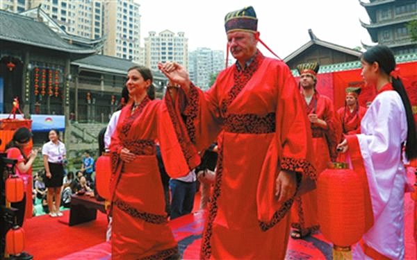 在南溪古街,由12名歐洲熊貓粉絲傾情演繹的漢式集體婚禮成為線路考察中的一大亮點。在悠揚的誦讀聲中,身著漢式服裝的“新人”依次入場,禮道兩旁的侍女持宮燈引導,新人行拜堂、沃盥、對席、同牢、合巹、結發(fā)、執(zhí)手禮,整套漢式婚禮禮儀逐一演繹,讓習慣了婚紗禮服的老外們親身感受了一番中國傳統(tǒng)婚俗文化。在這里,與會嘉賓們還實地參觀了著名小吃“南溪豆干”的制作流程,欣賞了極具當?shù)靥厣墓艠繁硌荨?